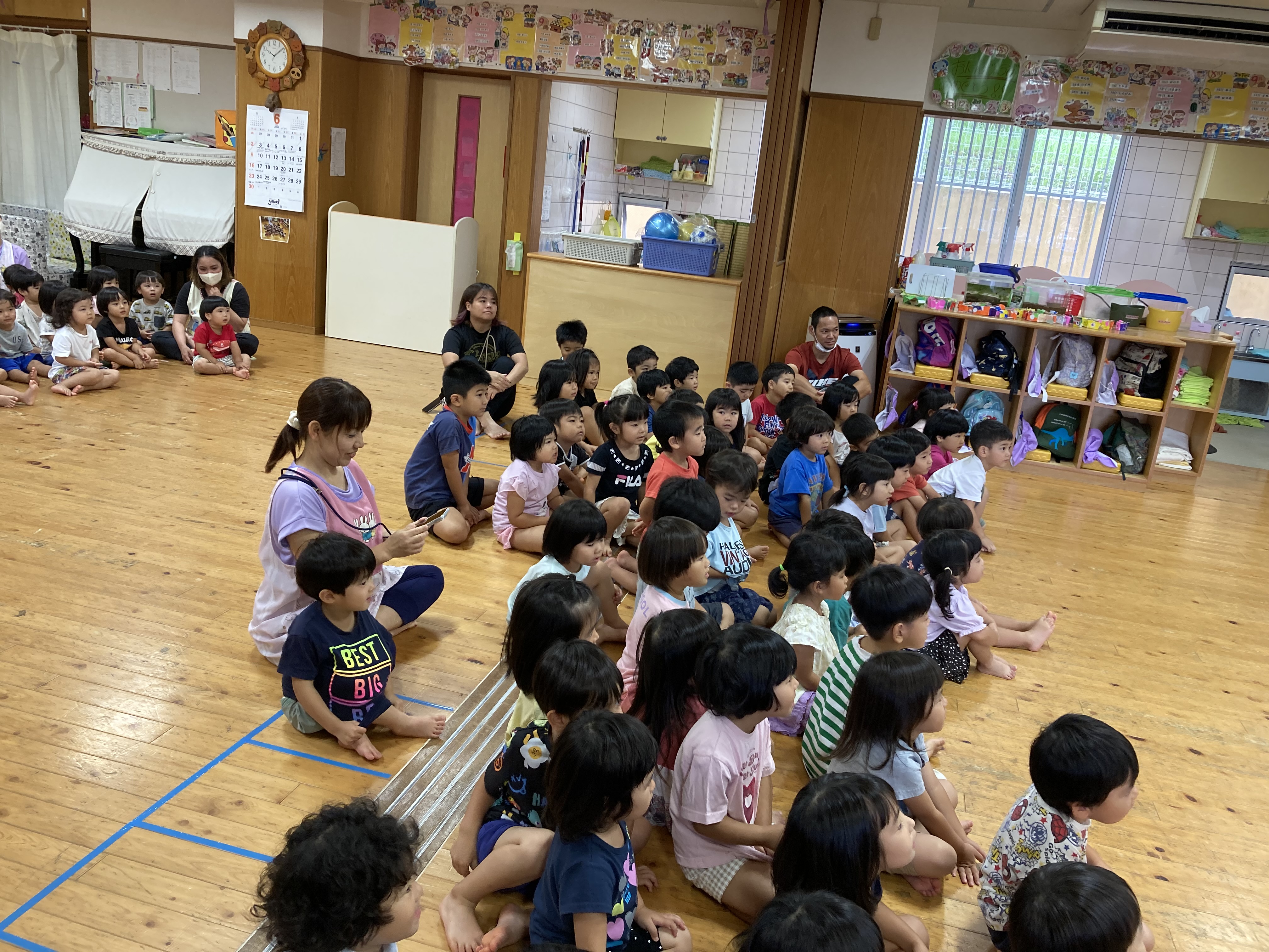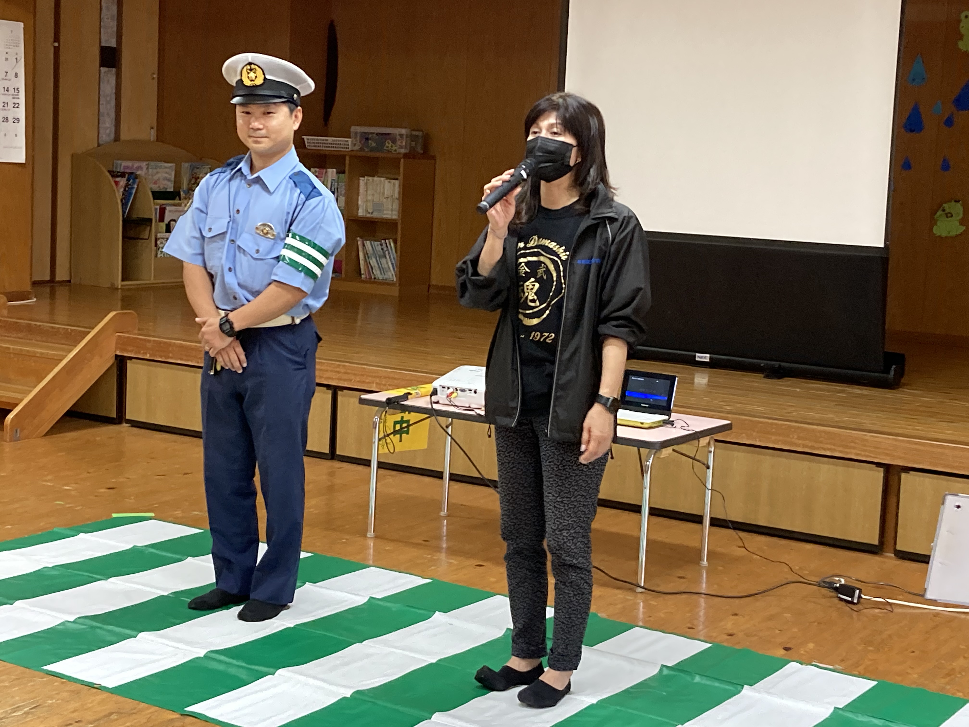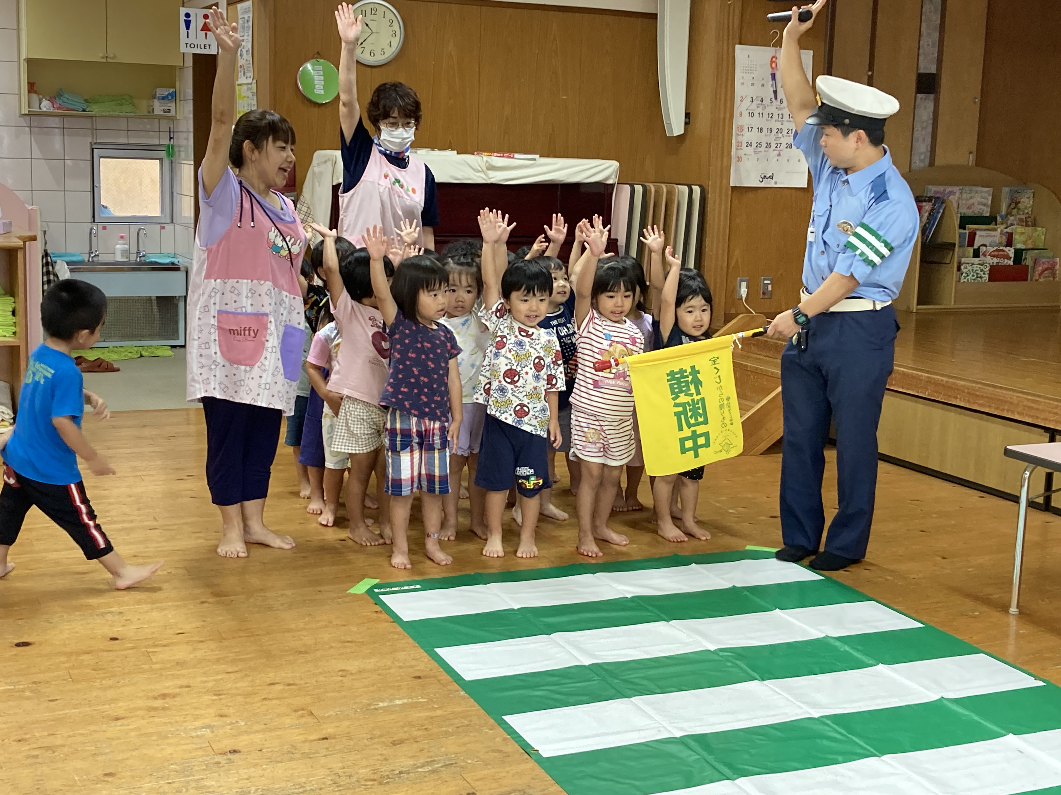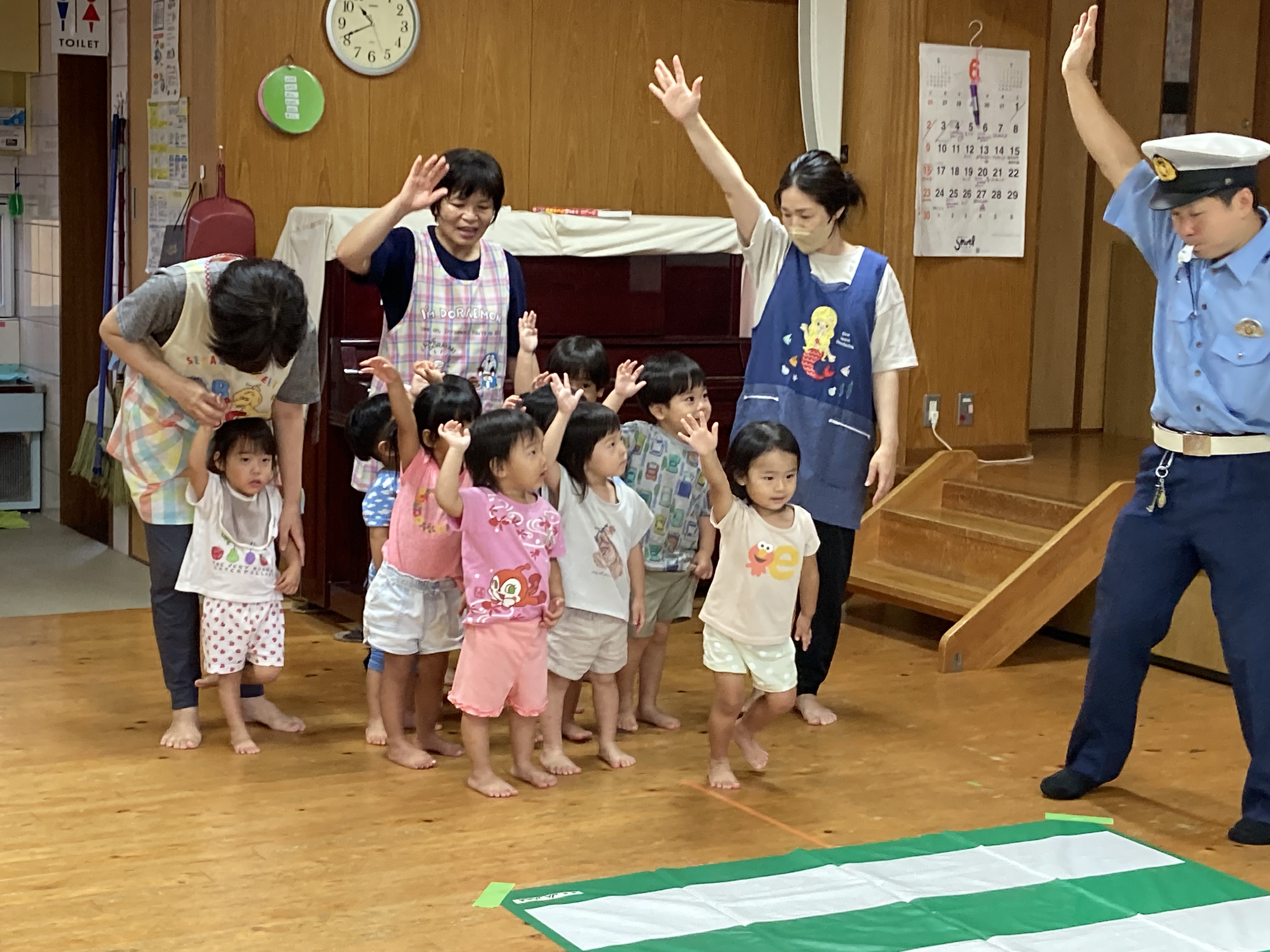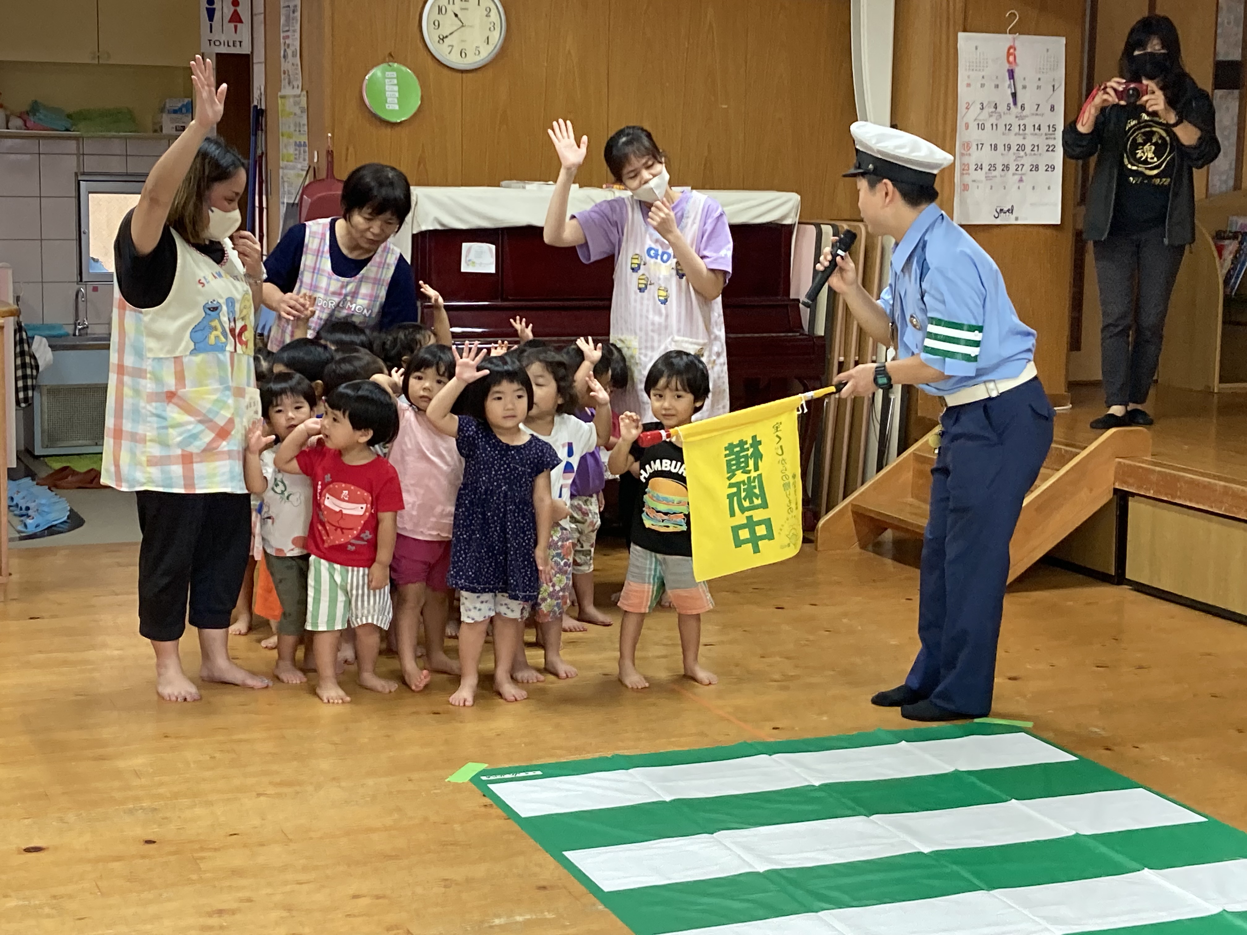 2歳児・3歳児・4歳児クラスを対象に与那原警察署のおまわりさんによる、安全指導を行いました。