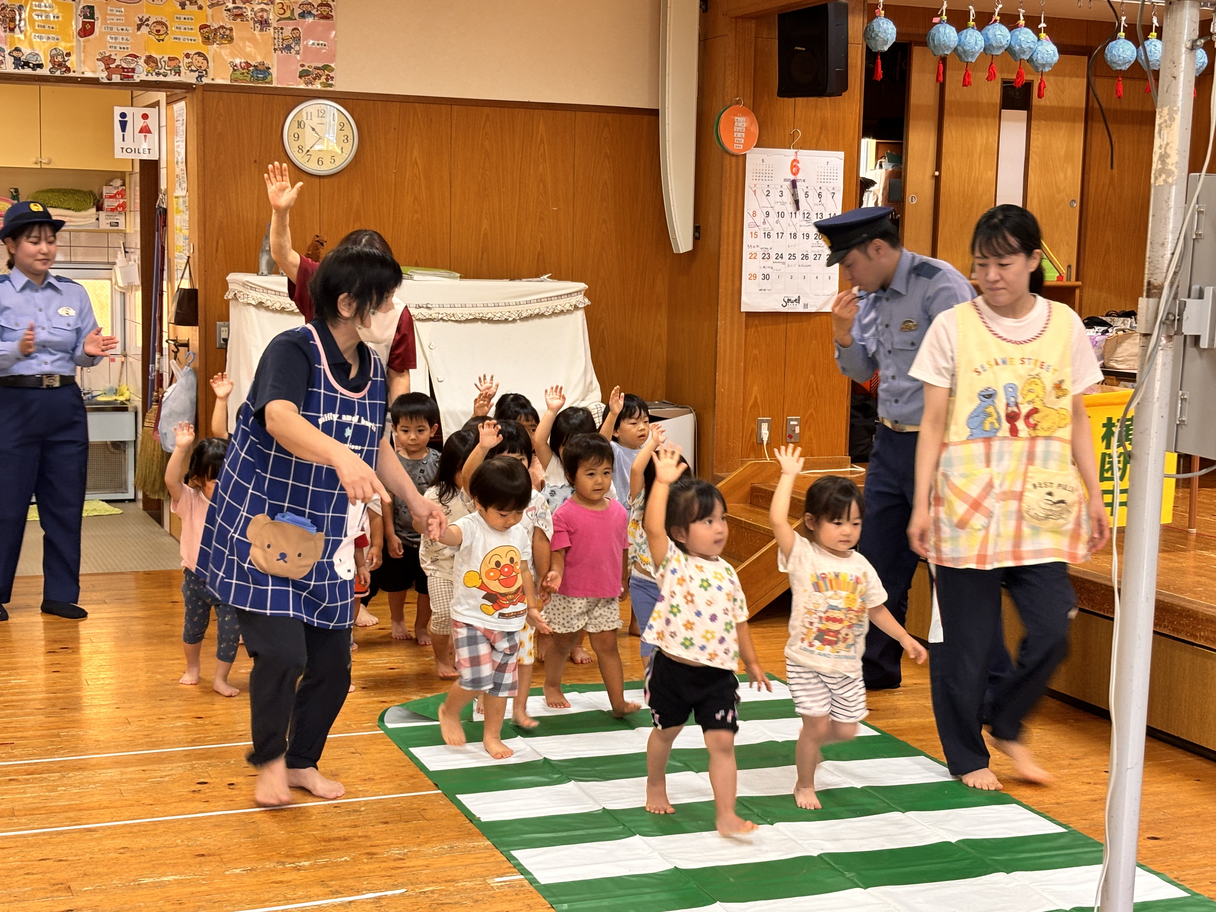 2歳児・3歳児・4歳児クラスを対象に与那原警察署のおまわりさんによる、交通安全指導を行いました。