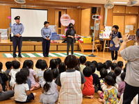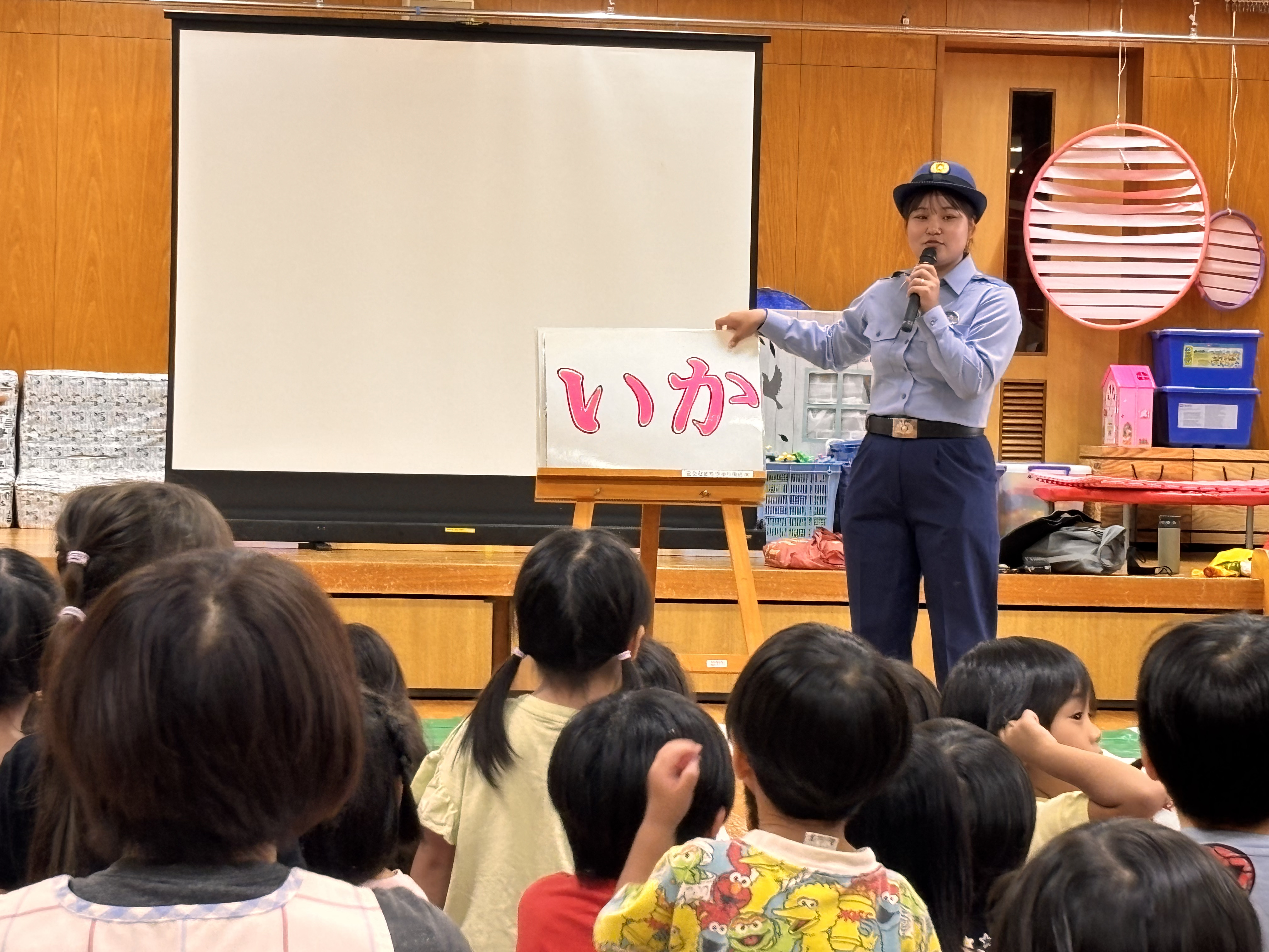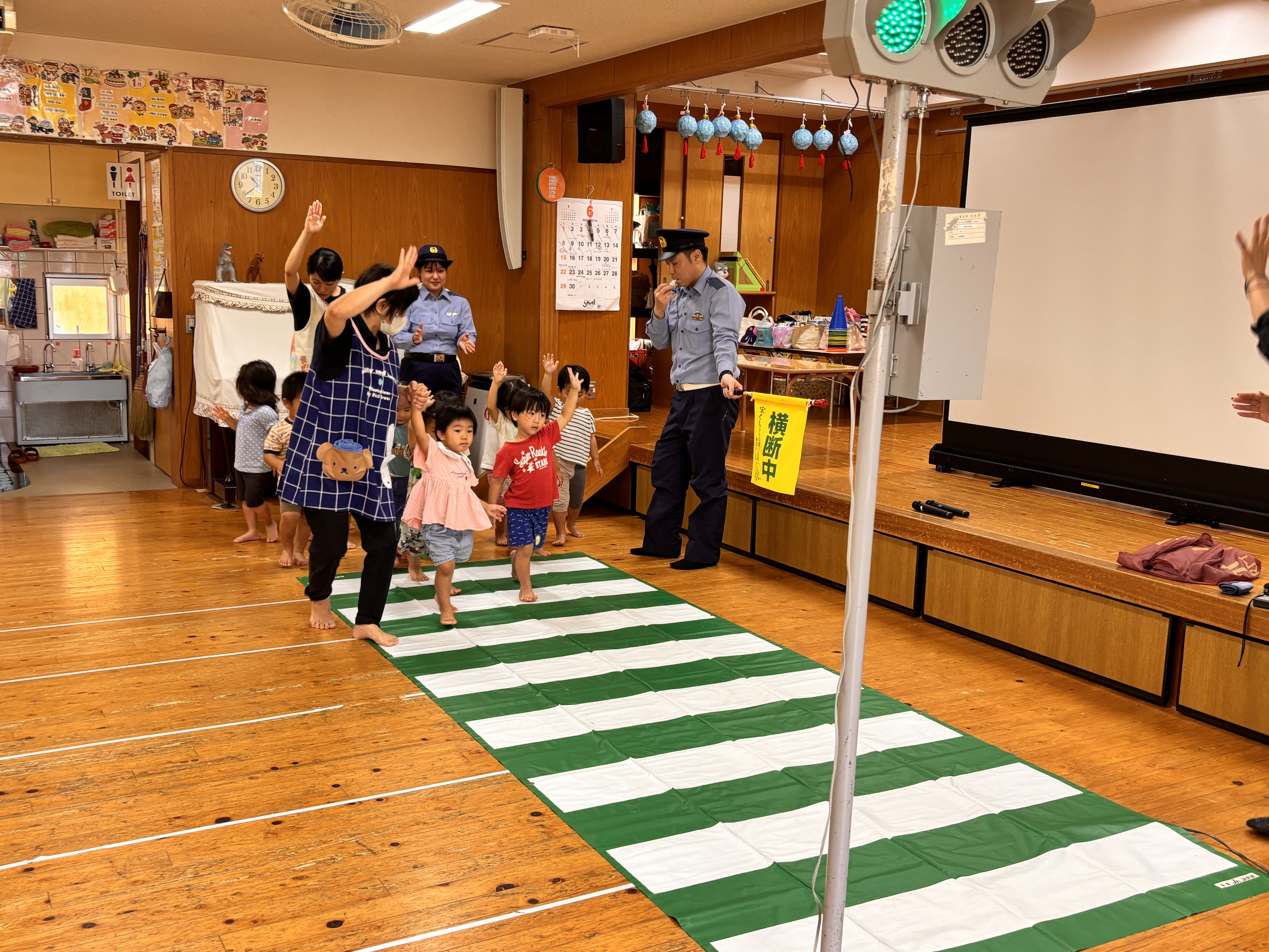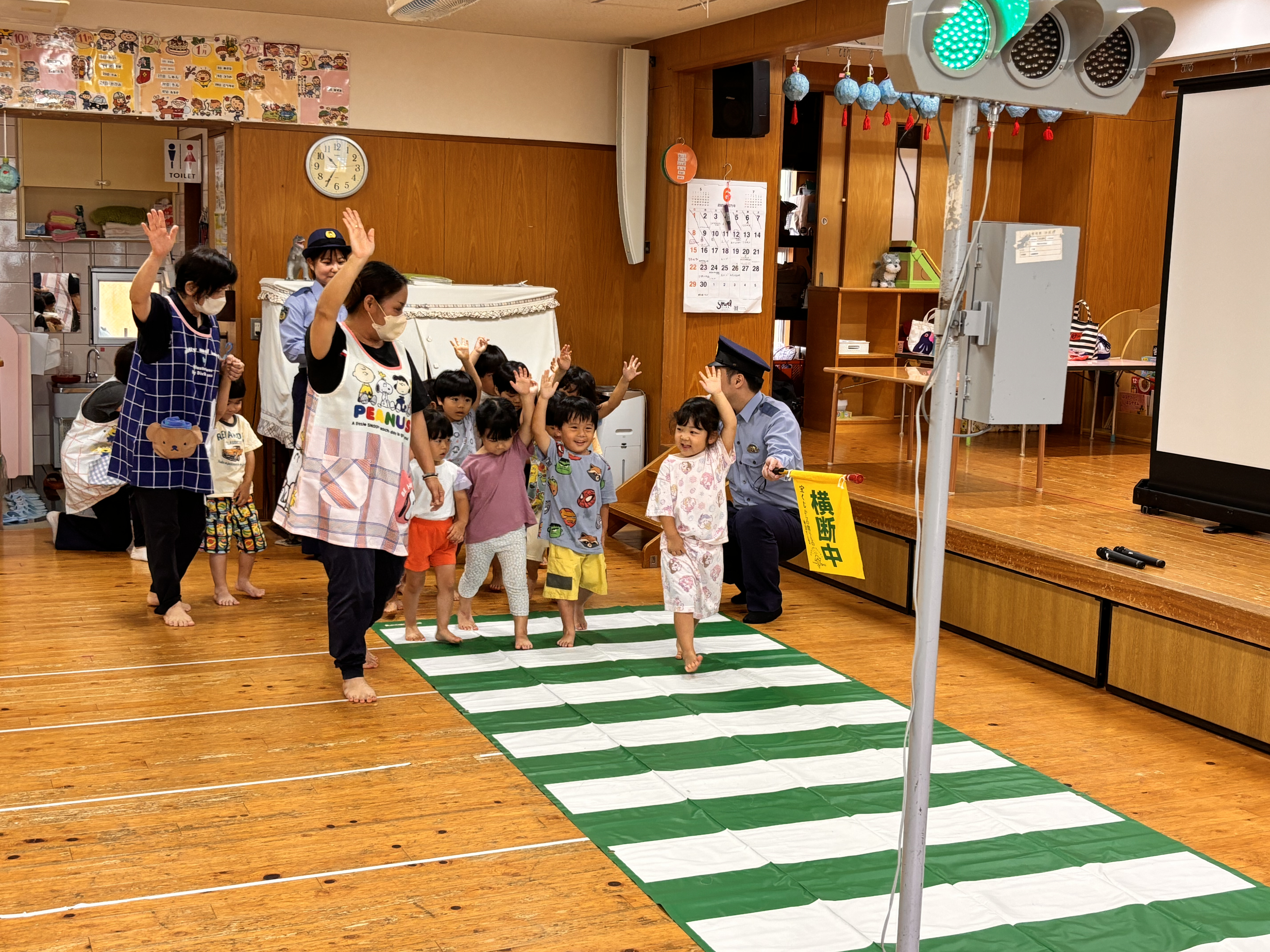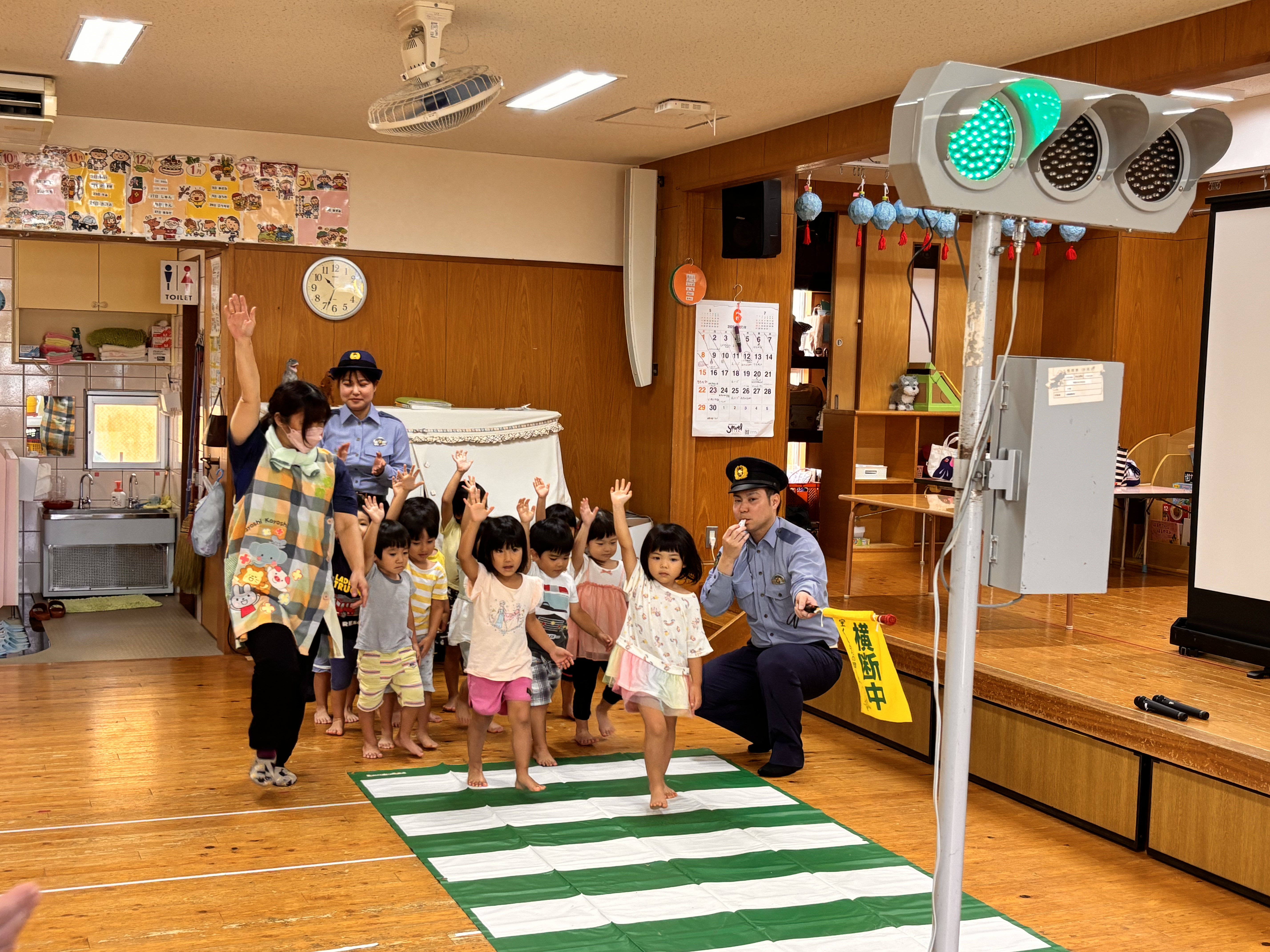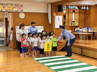 いかのおすしのお話や、横断歩道の渡り方の実践をしたり、腹話術人形(けんちゃん)と交通ルールを学ぶことができました。